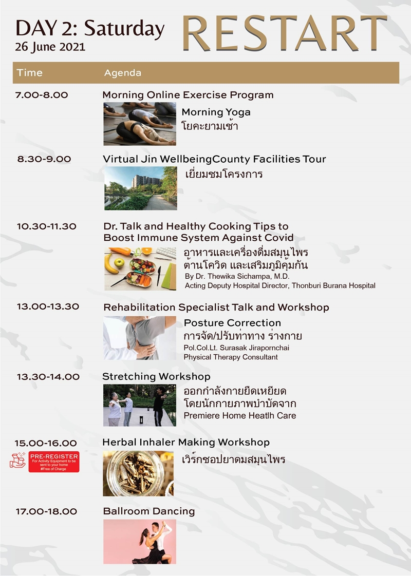 ตัวอย่างกิจกรรม สำหรับวันที่ 25-26 มิถุนายน 2564 จะเริ่มตั้งแต่ 7.00 – 18.00 น. ทั้งการออกกำลังยามเช้า โยคะ พร้อมไปกับนักเวชศาสตร์การกีฬาประจำโครงการ ปลูกผักสวนครัวที่ Jin Wellbeing Farm ร่วมคลาสเรียนศิลปะบำบัด ทำอาหารเพื่อสุขภาพ ดนตรีบำบัด เวิร์กช็อปเรียนทำยาดมสมุนไพร นัดหมายปรึกษาปัญหาสุขภาพกับแพทย์จากโรงพยาบาลธนบุรีบูรณา เป็นต้น และไฮไลต์คือ Doctor Talk รับฟังสาระความรู้ จาก พญ.กอบกาญจน์ ชุณหสวัสดิกุล ผู้อำนวยการ Jin Wellness Center ที่จะมาแนะนำเรื่องวัคซีนโควิด-19 การเตรียมตัวรับวัคซีนสำหรับผู้สูงวัย และการตรวจภูมิต้านทาน