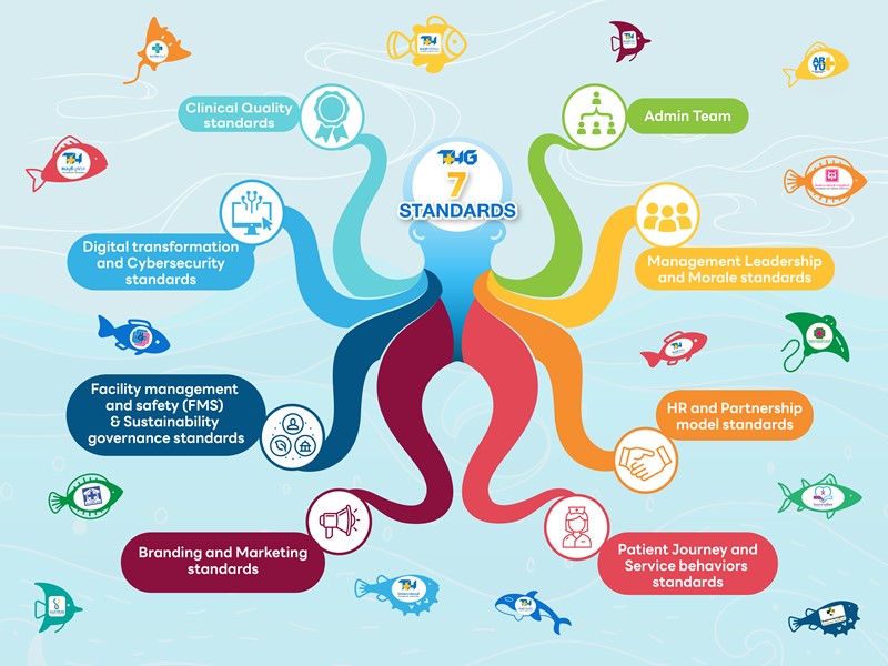 “เหตุผลที่เป็น 7 Standards เพราะ THG มองว่าเฮลท์แคร์ยุคใหม่ต้องไม่เพียงโฟกัสเฉพาะด้านการแพทย์เท่านั้น หากต้องรู้และเข้าใจสิ่งที่เกี่ยวข้องในภาพรวมทั้งหมด ทีมบริหารจึงวางกรอบดำเนินงานว่าควรพัฒนา หรือมีแนวทางปฏิบัติ 7 ด้าน ได้แก่ 1. มาตรฐานด้านคุณภาพทางการแพทย์ 2. มาตรฐานการนำดิจิทัลมาใช้เพื่อการเปลี่ยนแปลงและความปลอดภัยทางไซเบอร์ 3. มาตรฐานด้านการบริหารจัดการสิ่งอำนวยความสะดวกและความปลอดภัยและมาตรฐานการบริหารความยั่งยืน 4. มาตรฐานด้านการสร้างแบรนด์และการตลาด 5. มาตรฐานการสร้างประสบการณ์แก่ผู้ใช้บริการและพฤติกรรมการบริการ 6. มาตรฐานการพัฒนาและประสานความร่วมมือด้านทรัพยากรบุคคล 7. มาตรฐานภาวะผู้นำและการสร้างขวัญและกำลังใจ โดยทั้ง 7 ด้านนี้โรงพยาบาลในเครือจะต้องมีความรู้ ความเข้าใจ และปฏิบัติได้ภายใต้แนวทางเดียวกัน”